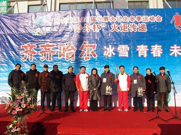 21日10时,哈尔滨第24届世界大学生冬季运动会火炬接力齐齐哈尔传递活动在我校中区广场举行了隆重的起跑仪式。在起跑仪式现场,市委书记杨信代表市委、市政府致词。市委常委、常务副市长张贵海主持仪式。大冬会组委会官员、省教育厅领导、市委、市政府领导、在齐高校领导、教师和学生代表等参加了起跑仪式。