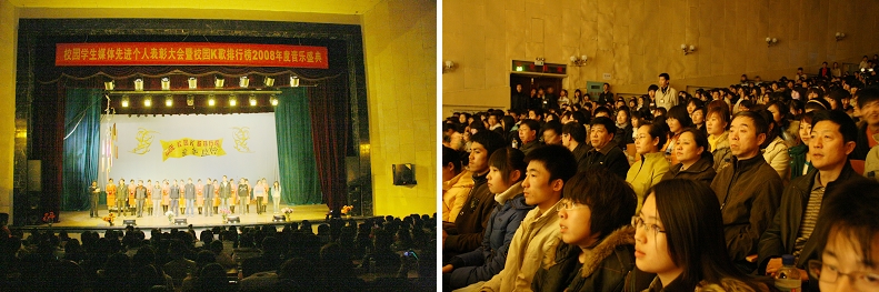 来自大学生记者团、广播台、青年报社、教育与传媒学院的50名获得表彰的同学上台领奖,千余名学生等参加了此次表彰会暨校园K歌排行榜2008年度音乐盛典活动。