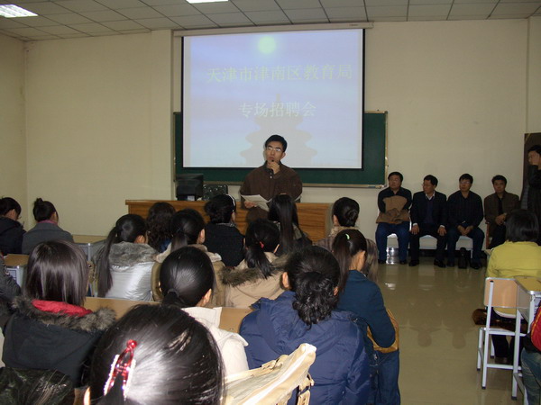 2008年11月11日,天津市津南区教育局一行13人,由教育局副局长带队,会同津南区人事局、津南区纪委、津南区教育局教育研究室及相关中学的校长,组成专家招聘团来我校集中选聘人才。经过资格审查、笔试、面试、试讲等一系列环节,我校共有地理、化学、历史、数学、中文5个专业的16名毕业生与用人单位成功签订了就业协议。