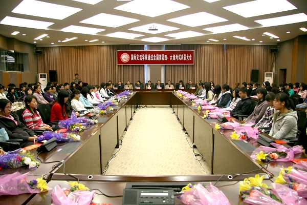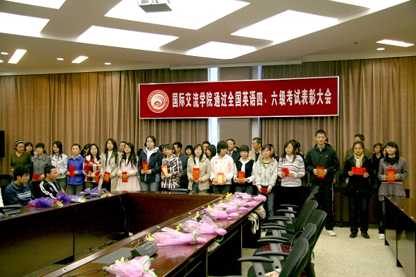 表彰会上,出席会议的领导和嘉宾向受表彰同学颁发了由韩国大成食品有限公司提供的奖金。国际交流学院院长郭寒竹作了讲话。他在讲话中向以优异成绩通过英语四、六级考试的学生表示祝贺,并充分肯定了该院06级学生勤奋上进、踏实刻苦的学习精神,勉励他们志存高远、发奋成才,不断超越自我,取得更大更好的成绩。受表彰的06级学生代表杨海凤同学现场作了经验介绍。国际交流学院07、08级的学生代表分别作了发言并表示以实际行动把国际交流学院良好的学风发扬光大。