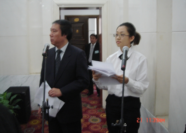 19日晚,我校外语学院王超老师带领果威及谭叶两名学生在哈尔滨市政府举行的欢迎宴会中担任翻译。
