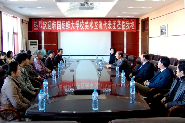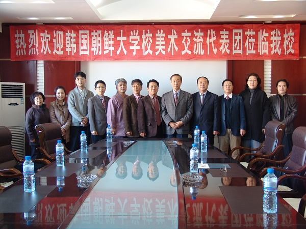 韩国朝鲜大学校美术大学艺术交流团金钟京教授代表艺术团一行作了发言。他对我校的热情接待及我校为本次美展所做的工作与努力表示感谢,他说两校间的友好合作与交流将不断得到加强并不断拓展新的空间,他祝愿我校越办越好。简短的会谈结束后,宾主双方互赠纪念礼品,并合影留念。