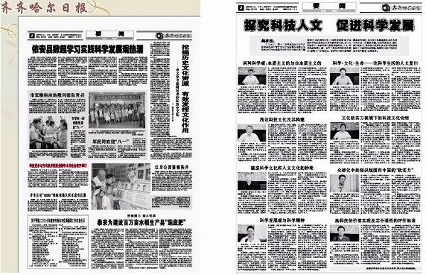 7月31日出版的《齐齐哈尔日报》要闻版对此次学术会议情况作了热忱报道。8月5日出版的《齐齐哈尔日报》要闻版专版遴选了清华大学卢风教授、华南理工大学彭纪南教授、华中科技大学万小龙教授、中国科学院孟建伟教授、浙江工商大学徐炎章教授、武汉理工大学杨怀中教授、东南大学吕乃基教授、tyc1286太阳集团王树松教授等8位专家的《高科技的价值实现及其合理性的评价标准》等8篇代表性学术论文,以图文并茂的形式作了题为“探究科技人文 促进科学发展”的整版的大篇幅报道,产生了积极而广泛的社会影响。