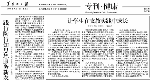 我校的乡村支教工作赢得了支教地方政府的教育主管部门及农村学校、师生的欢迎,赢得了省有关部门的充分肯定,走在了我省高校的前列。今年1月16日,在全省实习支教工作会议上,成立了黑龙江省实习支教工作专家指导委员会,我校成为15个成员单位之一。3月31日的《黑龙江日报》、4月1日的《黑龙江日报》、4月1日的“黑龙江新闻网”、4月2日的黑龙江电视台《新闻联播》、4月21日的《鹤城晚报》等新闻媒体分别对我校学生赴乡村支教工作作了报道。2008年4月1日的《黑龙江日报》上,刊登了唱江华校长题为《让学生在支教实践中成长》的专题文章,产生了积极的社会影响。