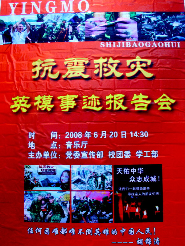 我校党委副书记王凤琴在主持报告会时指出,2008年5月12日发生的汶川大地震,是新中国成立以来破坏性最强、波及范围最广、救灾难度最大的一次地震。地震发生后,在以胡锦涛同志为总书记的党中央坚强领导下,全党、全军、全国各族人民发扬一方有难、八方支援、自力更生、艰苦奋斗精神,万众一心,众志成城,迎难而上、百折不挠,取得了抗震救灾的重大胜利,涌现出无数可歌可泣的英雄模范,感动了中国,感动了世界。今天,我们邀请到的“齐齐哈尔抗震救灾英模事迹报告团”就是他们中的模范代表。他们坚持人民利益高于一切,祖国之爱高于一切,把人民受难的地方当作自己的战场,发扬一不怕苦,二不怕死的光荣传统,保持能打硬仗、连续作战的优良作风,哪里有险情,就战斗在哪里,哪里有困难,就出现在哪里,充分体现了人民武警的英雄本色,展示了人民武警忠于党、热爱人民、忠实履行职责的良好形象,也展现了鹤城人的新形象、新风采,更充分体现了齐齐哈尔人民对灾区人民的深情厚谊。他们的报告感人肺腑、催人奋进,是我们青年学子成长成才道路上一次深刻的教育和感悟。在这次抗震救灾中,涌现出来的许许多多的英雄模范人物,他们是我们这个时代的楷模,是我们学习的榜样。多难兴邦。每一次国家和民族的灾难,都会成为青年一代成长的力量。地震让我们失去了很多很多,但也让我们收获了爱,收获了尊重,收获了坚强,收获了信念与奋进。她要求,在报告会之后,全校各级团学组织和广大青年学生要迅速掀起学习抗震救灾英模、弘扬抗震救灾精神的热潮,把伟大的抗震救灾精神转化为刻苦学习、发奋成才的强大动力,贯穿到学习生活中,落实在具体行动上,体现到优异成绩里,努力把自己培养成为德智体美全面发展的合格的社会主义建设者和可靠接班人。