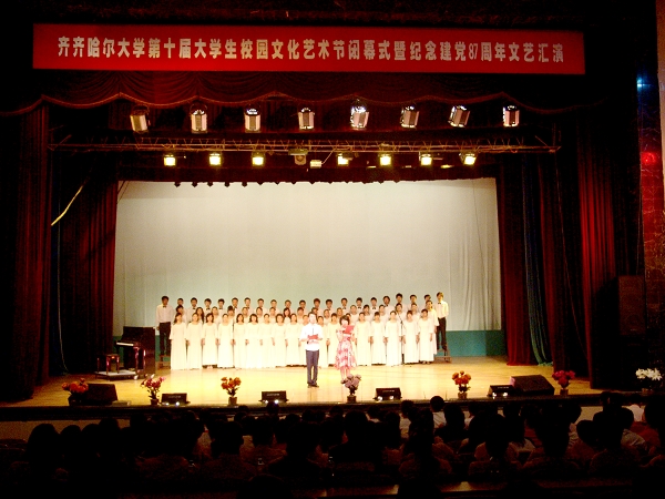 颁奖仪式之后,举办了纪念建党87周年文艺汇演,歌曲《把一切献给党》、诗朗诵《我的祖国》、舞蹈《北京欢迎你》都以不同的形式表达着同学们对党对祖国深深的敬意与热爱。以弘扬抗震救灾精神为题材的小品《相信爱》真实地反映了我校支援支教甘肃的毕业生在5.12地震中,情系灾区、心系学生、无私奉献的高尚品格和拳拳爱国之心。