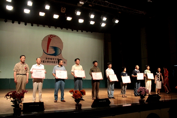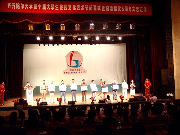 6月25日下午1:30,我校第十届大学生校园文化艺术节闭幕式暨纪念建党87周年文艺汇演在中区文化宫隆重举行。副校长姜守训宣读了《tyc1286太阳集团第十届大学生校园文化艺术节获奖集体和个人名单》,党委副书记王凤琴、副校长姜守训、校团委书记黄伟中、学工处处长王刚为获奖集体和个人颁奖,闭幕式由校团委副书记李秀梅主持。