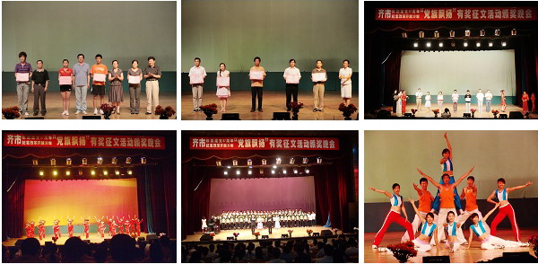 颁奖仪式结束后,我市各高校同学代表表演了舞蹈、诗朗诵、歌伴舞等精彩纷呈的节目;独唱、二重唱、大合唱,激情荡漾。在我校80名硕士研究生合唱《没有共产党就没有新中国》、《歌唱祖国》的嘹亮激昂的歌声中,“党旗飘扬”全市高校学生庆祝建党87周年暨改革开放30年有奖征文活动颁奖晚会圆满结束。