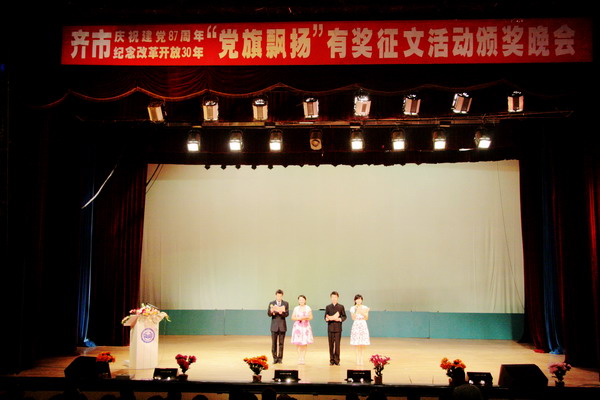 6月27日晚,“党旗飘扬”全市高校学生庆祝建党87周年暨改革开放30年有奖征文活动颁奖晚会在我校中区文化宫隆重举行。