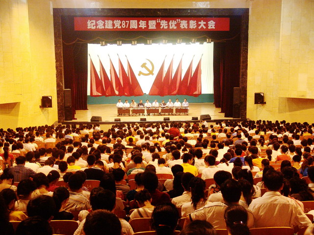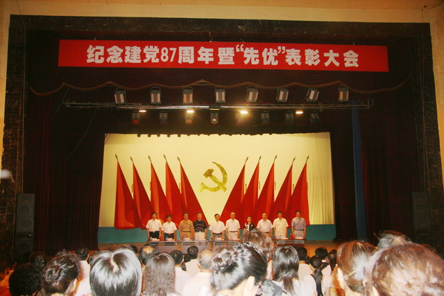6月30日下午,在雄壮的国歌声中,我校“纪念建党八十七周年暨‘先优’命名表彰大会”于中区文化宫隆重召开。