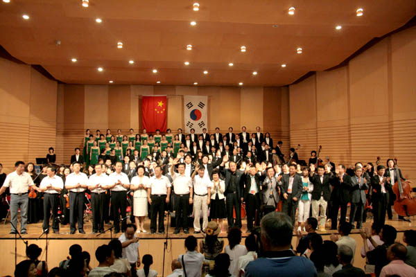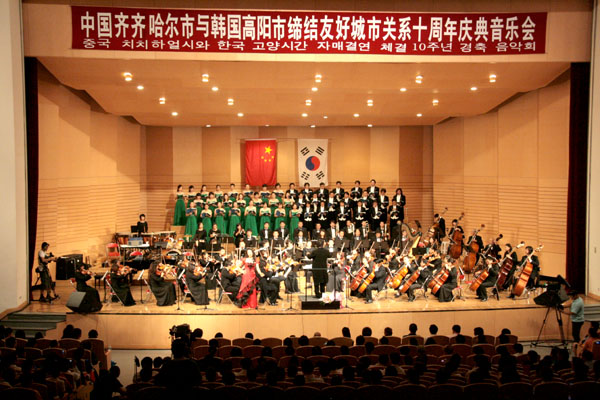 我校领导唱江华、史铁成、王风琴、曲伟建、郑喜群、吕晓辉等陪同市领导杨信、刘刚、高环、张贵海、李百炼等及韩国高阳市市长姜贤锡、议员金永植一行,同来自齐市各界的千余名观众共同欣赏了由高阳市立合唱团、齐市教师合唱团及我校交响乐团同台演出的音乐会。
