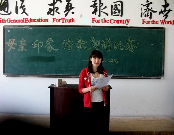 活动中,优美的旋律、感人的朗诵,深深感染了现场的每一位观众,爱的阳光洒着整个会场。特别是两位留学生一口标准的中文口语让同学们折服。经过两个小时文雅而又激烈的角逐,对外汉语专业07级的五名同学脱颖而出,072班的张明瑶同学获得了第一名。