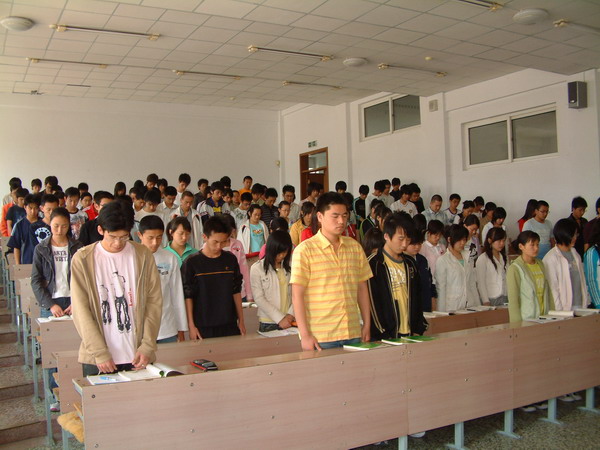 学校机关各部门、图书馆、档案馆、计算中心、社科部、学报编辑部等单位的全体人员、化学与化学工程学院、通信与电子工程学院、经济管理学院、轻工纺织学院等单位无课的教师和学生在中区广场参加了由学校统一组织的集体默哀。