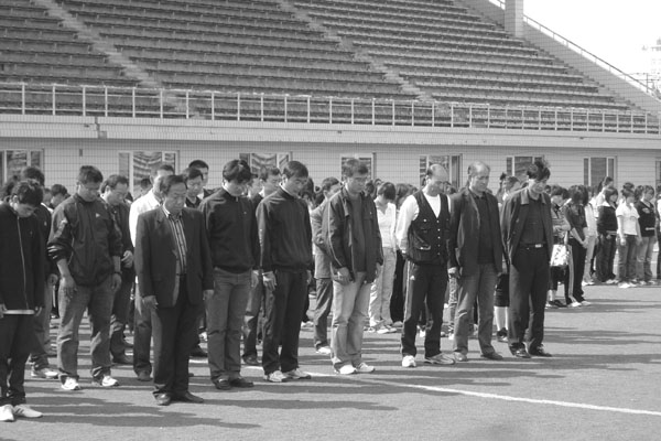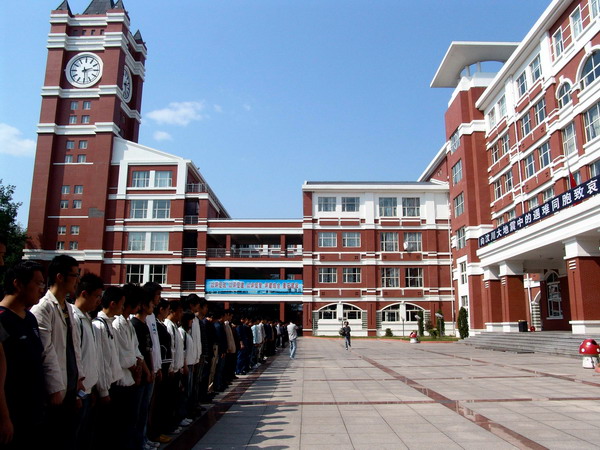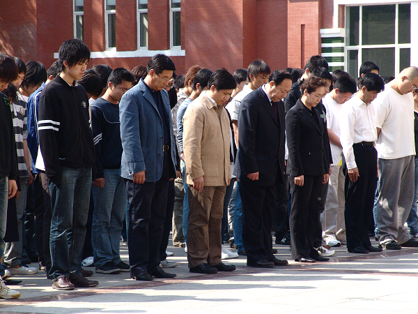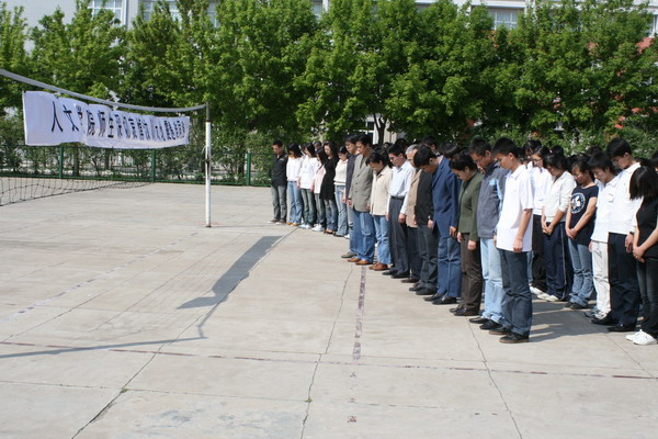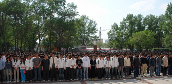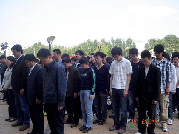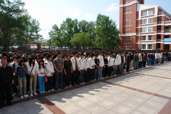 在校的校领导王凤琴、曲伟建、郑喜群、吕晓辉与万名师生同殇。副校长曲伟建在中区主楼前主持了集体默哀仪式。他指出:“今天我们全校在这里举行集体哀悼,以表达对汶川大地震遇难同胞的深切缅怀和追思,愿逝者安息,生者坚强。”