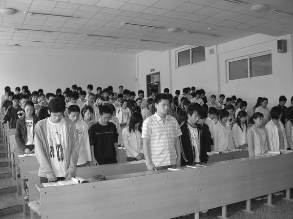 全校各教学楼铃声响起,正在上课的学生,由任课教师组织所在班级学生全体起立默哀3分钟;没有课的教师和学生由所在单位负责组织集体默哀3分钟。
