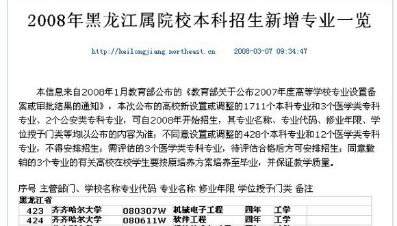 根据2008年1月教育部公布的《教育部关于公布2007年度高等学校专业设置备案或审批结果的通知》,本次公布的高校新设置或调整的1711个本科专业自2008年开始招生。