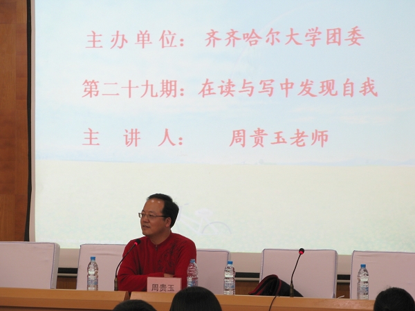 讲座中,周贵玉老师就中国文学的过去、现在状况和未来的发展趋势做出了深刻的剖析,使同学们对文学有了更深刻地了解。周老师还讲述了自己从文学少年到文学青年的历程,他表示是文学让他的人生更有意义,爱好文学是他人生的一大幸事。在文学的世界里、在读和写的过程中感受着真实的自我、丰富着自己的人生,数十年来他从来没有改变过对文学的热爱,这份对文学的执着感动了现场的每一位同学。整场讲座他都以兄长的身份与我校文学爱好者探讨人生,从编者的角度研究文学发展,他从“不要太看得起自己”和“不要太看不起自己”两个方面讲述了如何在读与写中发现自我,要求同学们要勇于战胜自己、突破自己、超越自己,他还强调多看书、多实践的重要性。同时,周贵玉老师表示如果时机成熟,他们还将在齐大设立文学奖学金以鼓励广大文学爱好者。最后,周老师热心地解答了现场同学提出的问题。