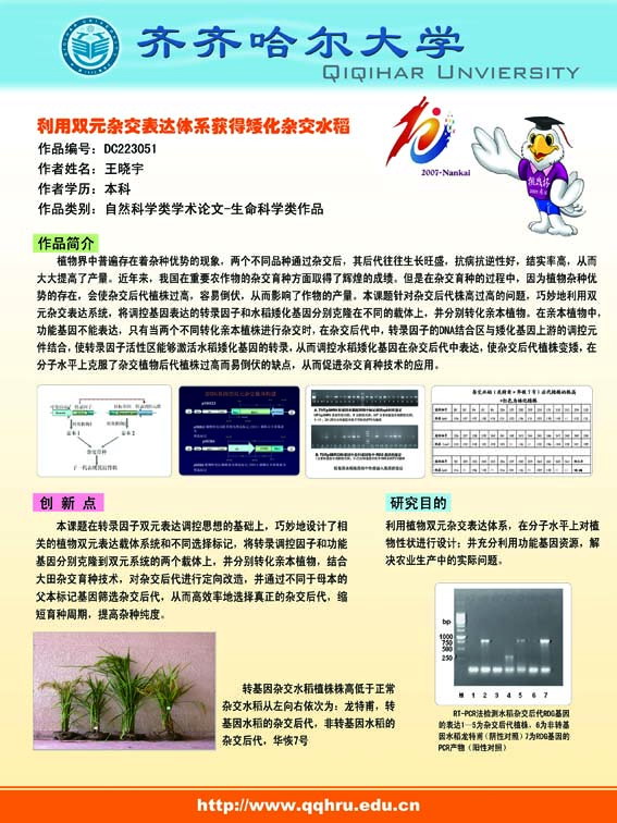 11月19日,第十届“挑战杯”全国大学生课外学术科技作品竞赛终审决赛成绩在南开大学揭晓。我校生命科学与工程学院王晓宇同学的作品《利用双元杂交体系获得矮化杂交水稻》荣获二等奖。