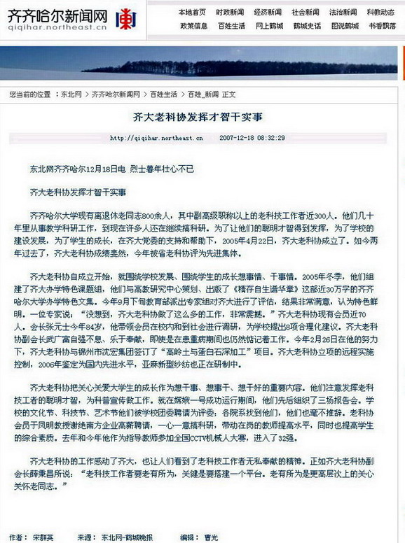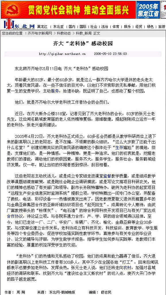 他们的事迹和精神感动了齐大人,赢得了全校万名师生员工的尊敬与爱戴,也赢得了教育部本科教学水平评估专家的赞誉和新闻媒体的热忱报道。2006年5月10日,《鹤城晚报》发表了题为《齐大老科协感动校园》的专题报道,全面报道了老科协的感人事迹,产生了积极而广泛的社会影响。2007年12月18日,《鹤城晚报》以《烈士暮年壮心不已—齐大老科协发挥才智干实事》对我校老科协一年来取得的新成绩又给予了热忱报道。