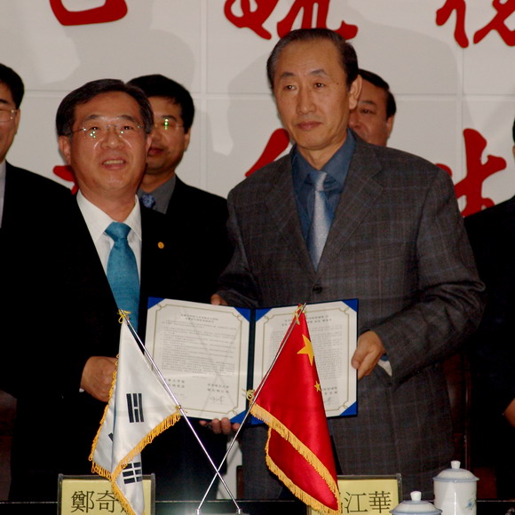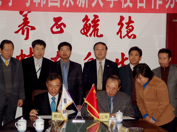 工作会议结束后,唱江华校长代表学校、郑奇彦总长代表韩国东新大学校在中外合作办学有关文本协议上签字。