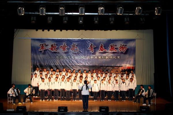 学子放歌,喜迎国庆。9月26日下午2:00,我校2007级军训新生在学校文化宫内举行了主题为“军歌嘹亮 青春激扬”的军训歌咏比赛,喜迎建国58周年。校党委副书记王凤琴与参训师生一起观看了比赛。