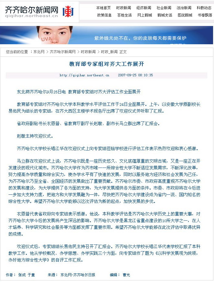 9月24日上午,我校接受教育部本科教学工作水平评估汇报会在西区主楼学术报告厅隆重举行。齐齐哈尔日报、鹤城晚报、齐齐哈尔电视台、齐齐哈尔广播电台等各新闻媒体派出记者,对开幕式和汇报会进行了专访,做了热忱报道。