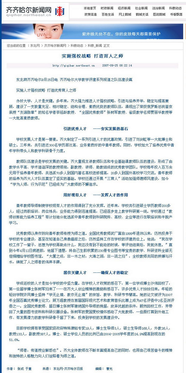 编者按:9月25日,《齐齐哈尔日报》刊发“tyc1286太阳集团教学评建系列报道之队伍建设篇”:“实施人才强校战略 打造优秀育人之师”。