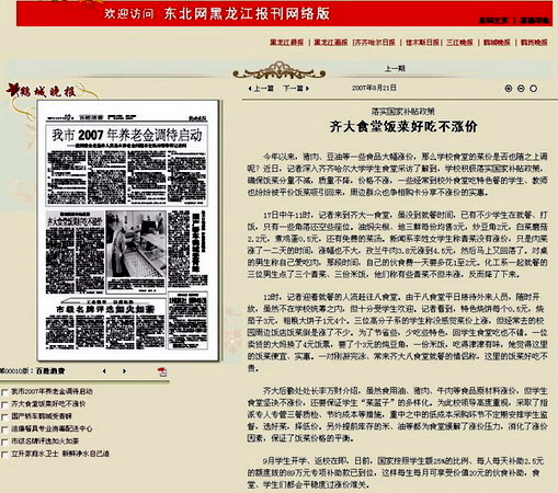 编者按:新学期初以来,在猪肉、豆油等一些食品大幅涨价的情况下,我校积极采取有效措施,认真落实国家补贴政策,确保饭菜分量不减,质量不降,价格不涨,以惠及师生的实际举措为构建和谐校园贡献力量。8月21日出版的《鹤城晚报》以《落实国家补贴政策 齐大食堂好吃不涨价》为题对我校给予了热忱报道。