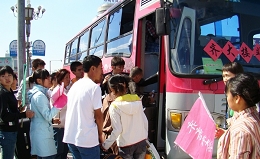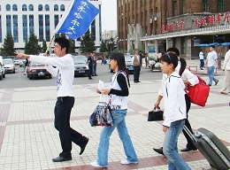 在火车站迎新接待点,我校工作人员按照学校的统一要求和部署,及时为刚刚走下火车的新生及家长提供周到而细致的服务。他们有的举着写有各院系标志的牌子为新生及家长引路;有的为新生提供细致的咨询,有的帮他们拿东西,有的为远道而来的学生家长排忧解难,停放在广场上的接送班车,为一路旅途奔波劳累的新生和家长提供免费服务,将他们顺利送达学校。