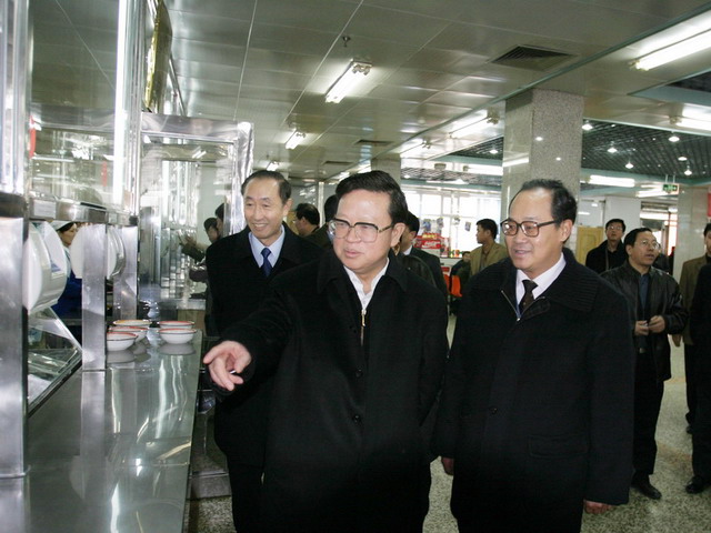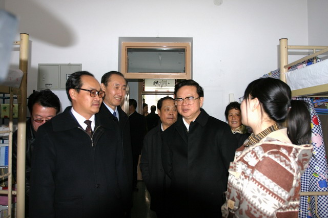 钱运录等省市领导一行在校领导的陪同下,参观了校园,视察了艺术中心、学生食堂、学生宿舍、实验室等处。美丽的校园、现代化的音乐厅、宽敞明亮的学生餐厅、温馨和谐的学生公寓,以及先进的核磁共振实验室给省市领导留下了深刻印象。在学生餐厅,钱书记等一行走到售餐窗口,仔细察看询问了伙食情况,与就餐的学生亲切交谈。“每月的伙食费得多少啊?家里能承受吗?要好好学习啊”,一句句亲切的话语,饱含着领导的关心和希望。在学生公寓,钱运录书记和刘东辉副书记与学生唠起了家常,关切地询问他们的学习和生活情况。