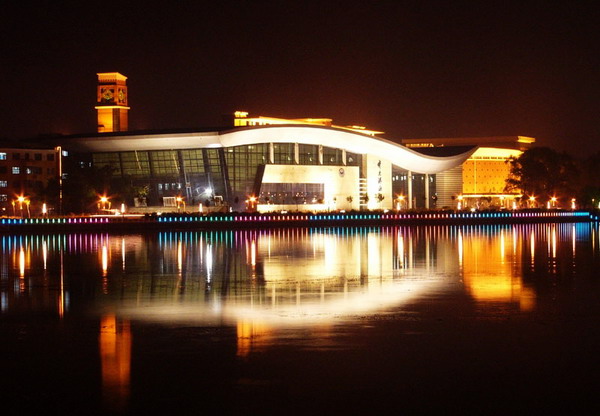 建筑是文化的风景。我校地处嫩江之滨闻名遐迩的丹顶鹤的故乡—魅力鹤城齐齐哈尔市,坐落于国家级水利风景区—劳动湖畔,倚江而建,环湖而起,享有“环湖大学”的美誉。学校自1996年组建至今的十余年间,一系列新建筑相继沿湖落成,校园面貌发生了翻天覆地的喜人变化。32000平方米的西区教学主楼、雍容典雅的46000平方米的中区综合教学楼、欧式风格的计算中心大楼、造型别致的万米体育馆和标准跑道的塑胶田径运动场、50米10泳道国际标准游泳馆、省内一流水准的音乐厅、美术馆等相继服务教学和科研。劳动湖畔的中区校园,距地面47米建起的四面大钟与周围景观浑然一体,最具有代表性。每当夜幕降临,霓虹光影中,图书馆、实验楼、教学楼3处顶层的7顶“博士帽”与大钟交相辉映,充分彰显着高雅、文明、创新、和谐的大学校园文化蕴涵。