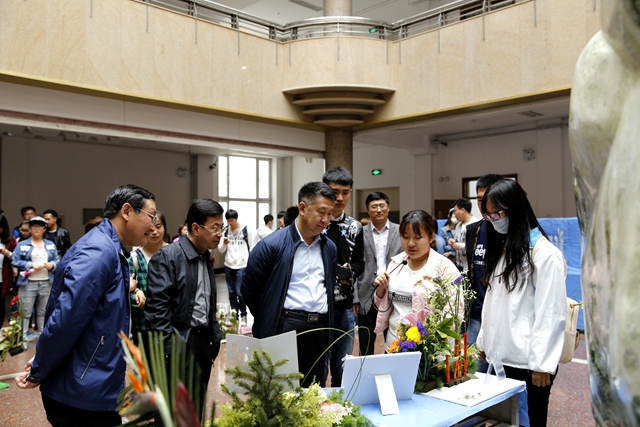 校长马立群,校党委副书记盖元臣,校党委常委、副校长李英杰到现场观看作品,听取参赛学生关于插花作品创意的说明,并给予了点赞和鼓励。学校办公室、党委宣传统战部、学生工作部(学生处)、实践教学与设备管理中心、校团委,生命科学与农林学院等部门(学院)领导、园林系师生等观看了比赛。