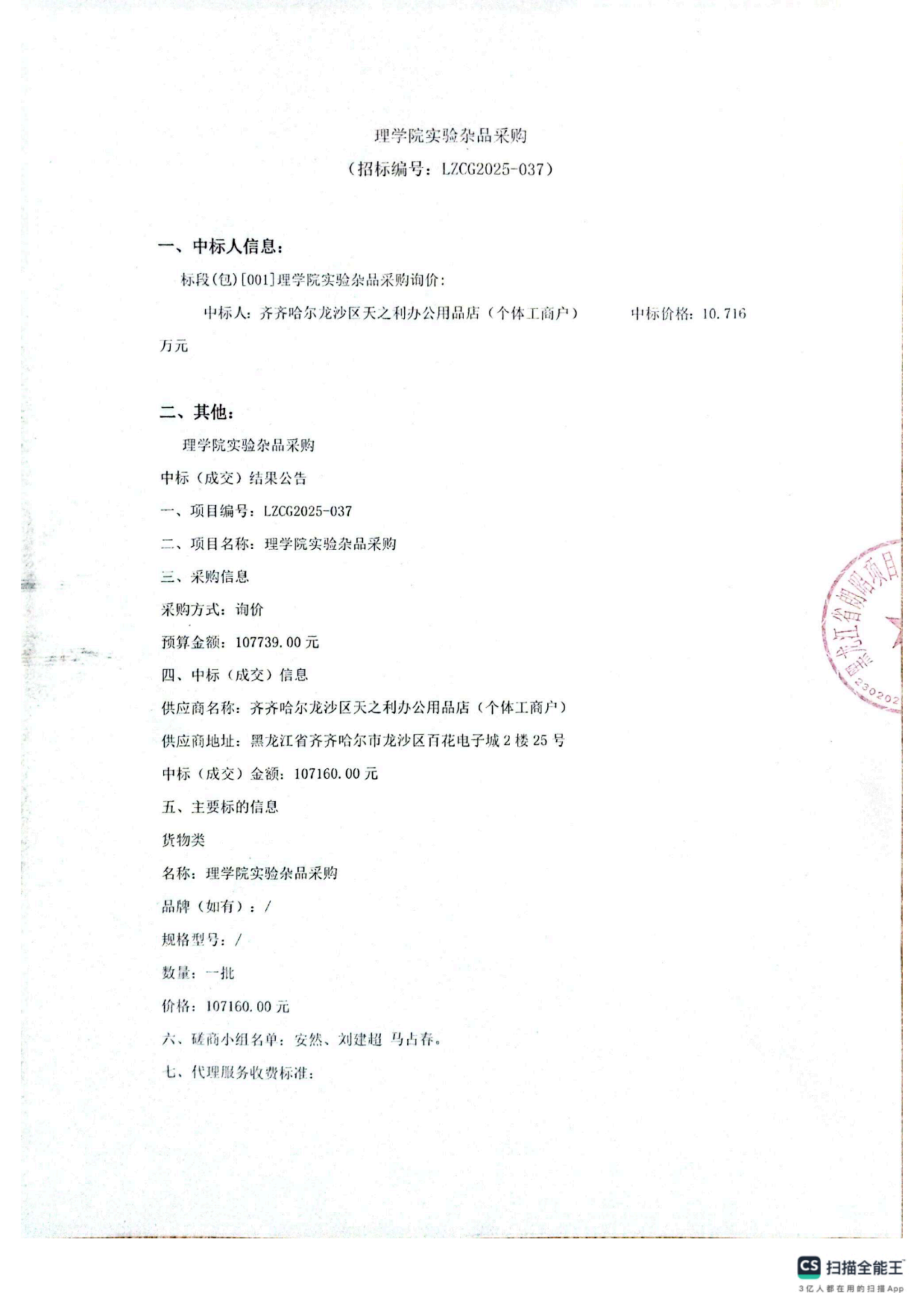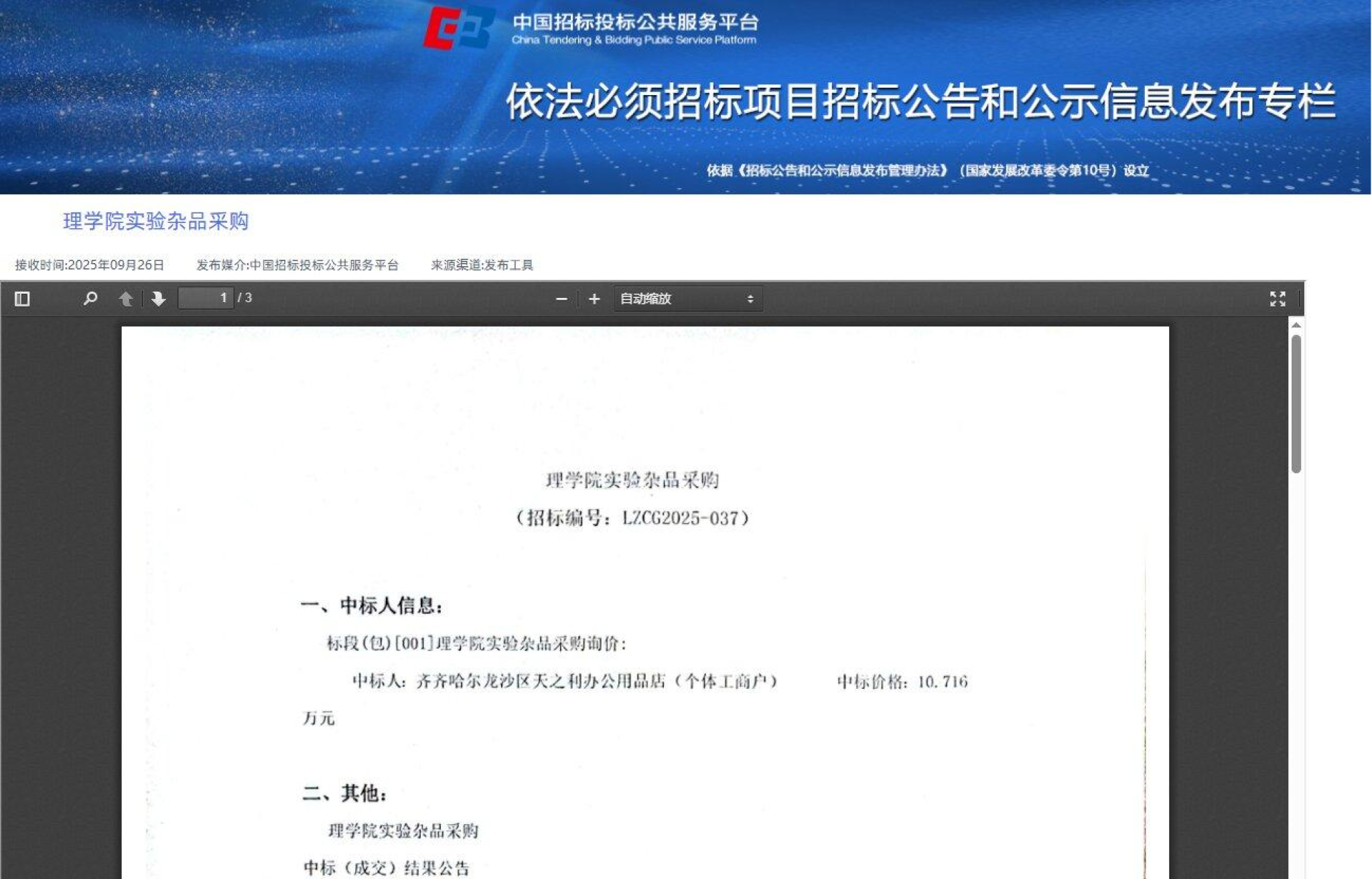 理学院实验杂品采购中标(成交)结果公告(转自中国招标投标公共服务平台)