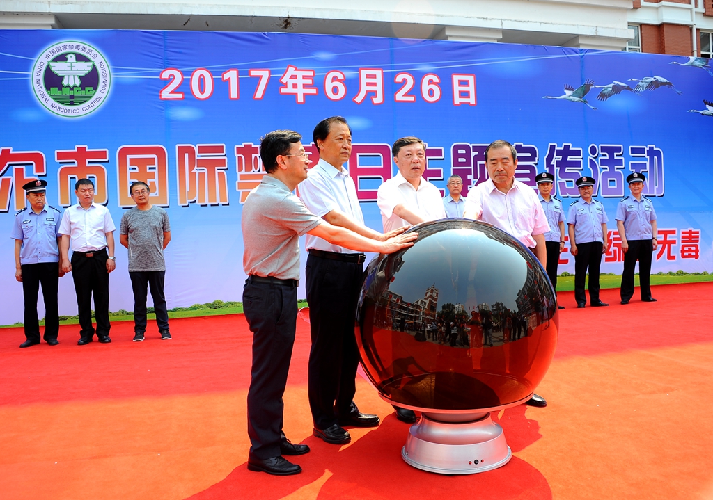 吴煜、马志军、郝明哲、盖元臣共同按亮了“6.27”青少年毒品预防教育工程启动球