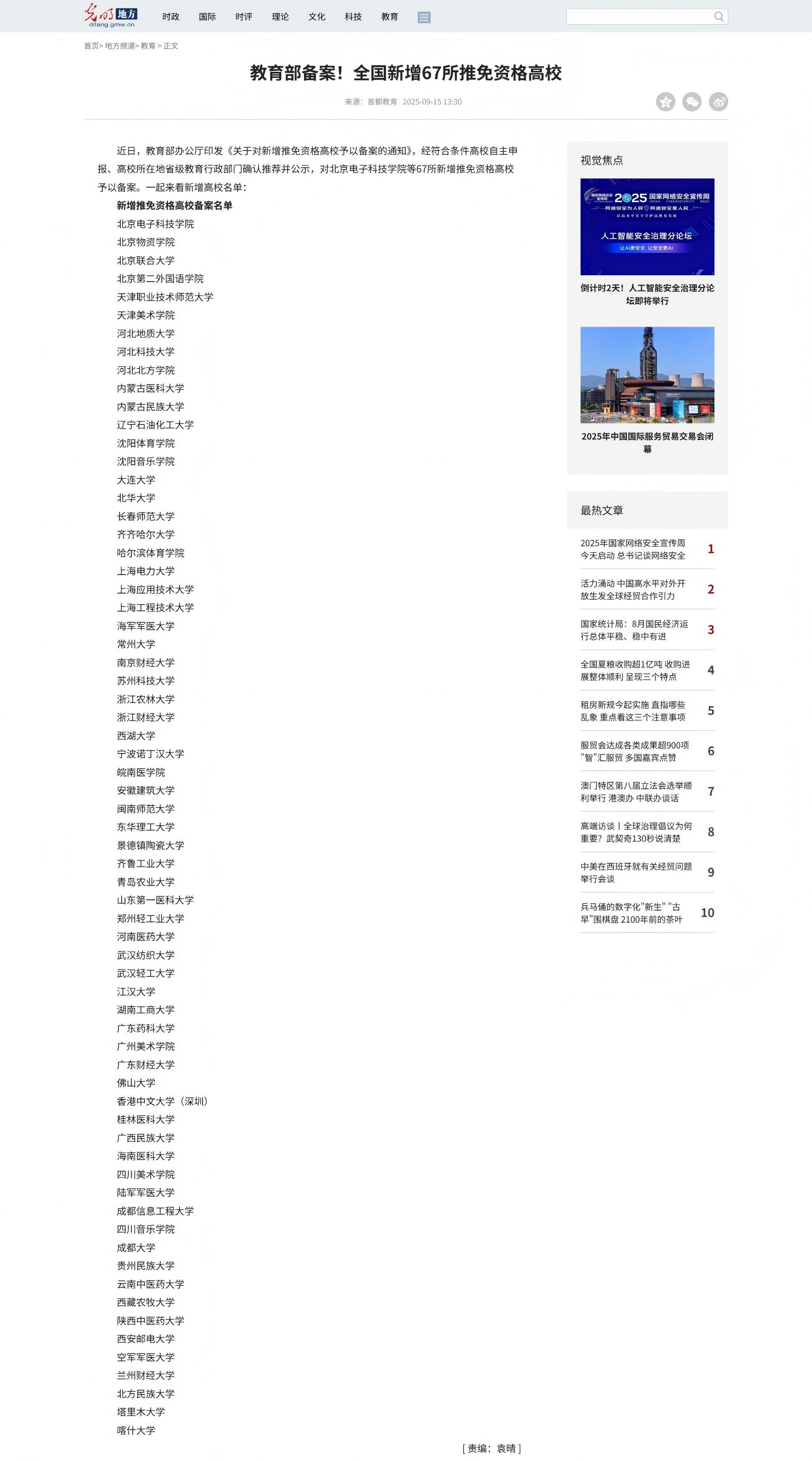 【光明网】教育部备案!全国新增67所推免资格高校