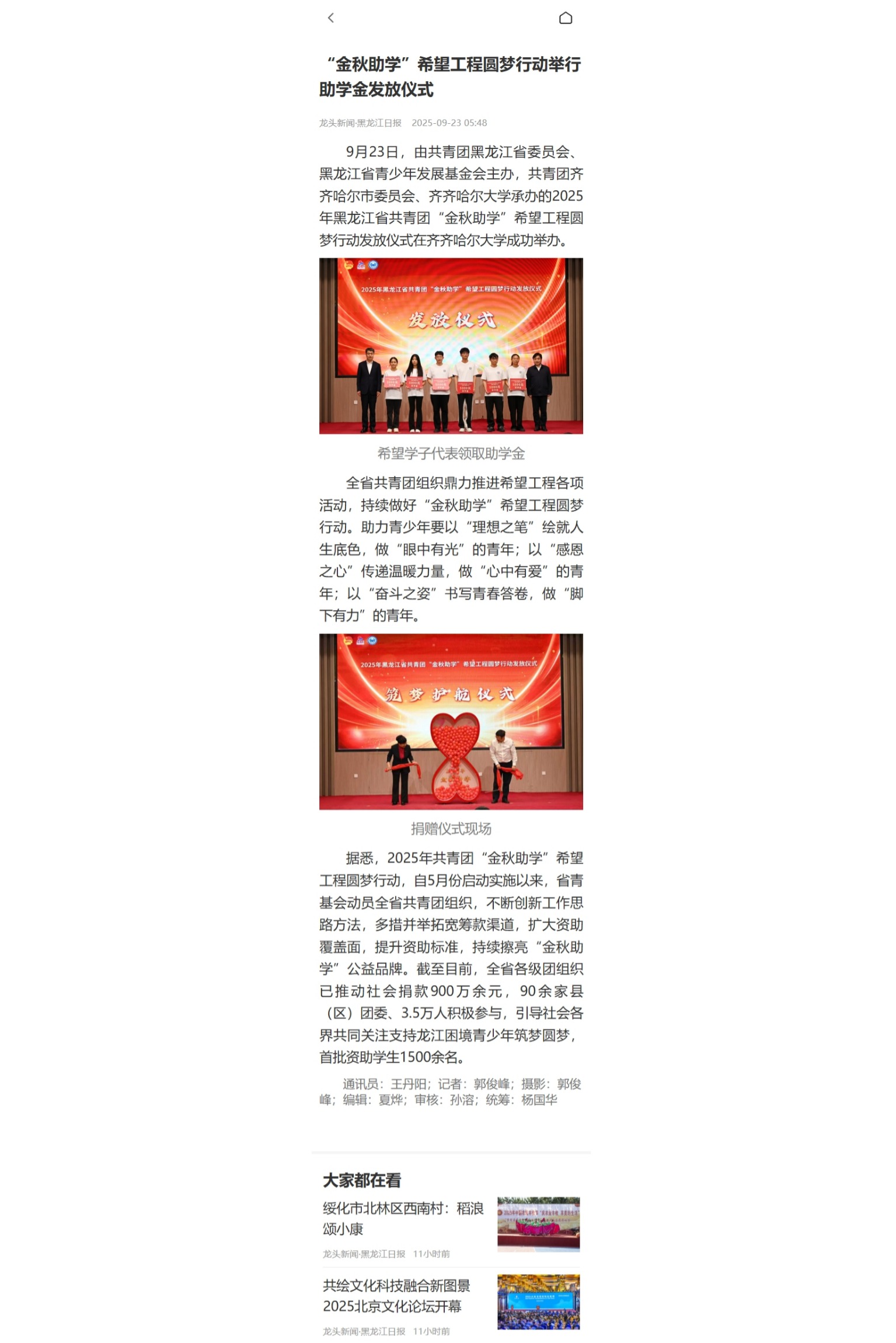 【龙头新闻】“金秋助学”希望工程圆梦行动进行时!齐齐哈尔地区获助学金100余万元
